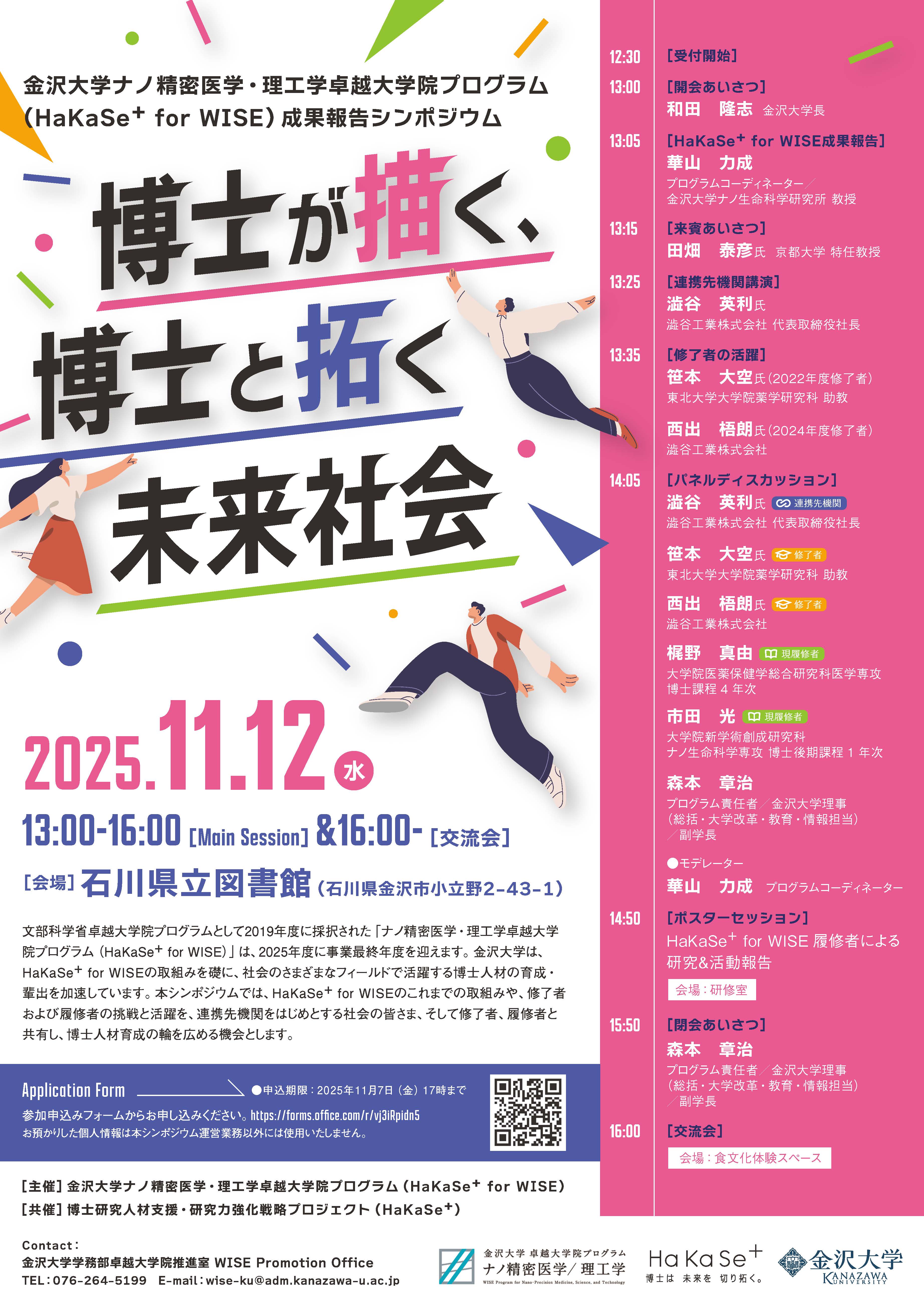 金沢大学 学務部卓越大学院推進室 WISE Promotion Office TEL:076-264-5199 E-mail:wise-ku(a)adm.kanazawa-u.ac.jp