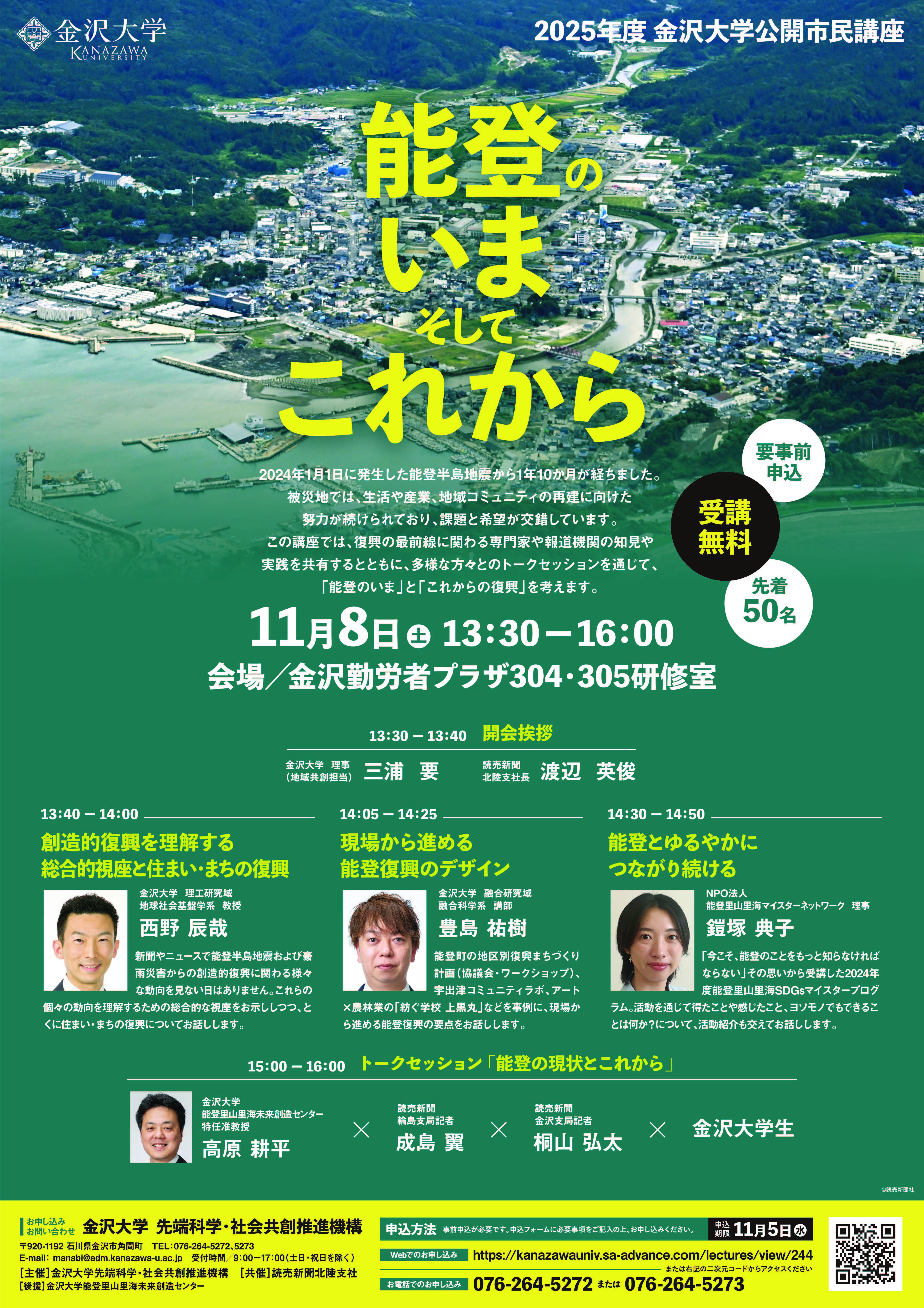 被災地では,生活や産業,地域コミュニティの再建に向けた努力が続けられており,課題と希望が交錯しています。この講座では,復興の最前線に関わる専門家や報道機関の知見や実践を共有するとともに,多様な方々とのトークセッションを通じて,「能登のいま」と「これからの復興」を考えます。