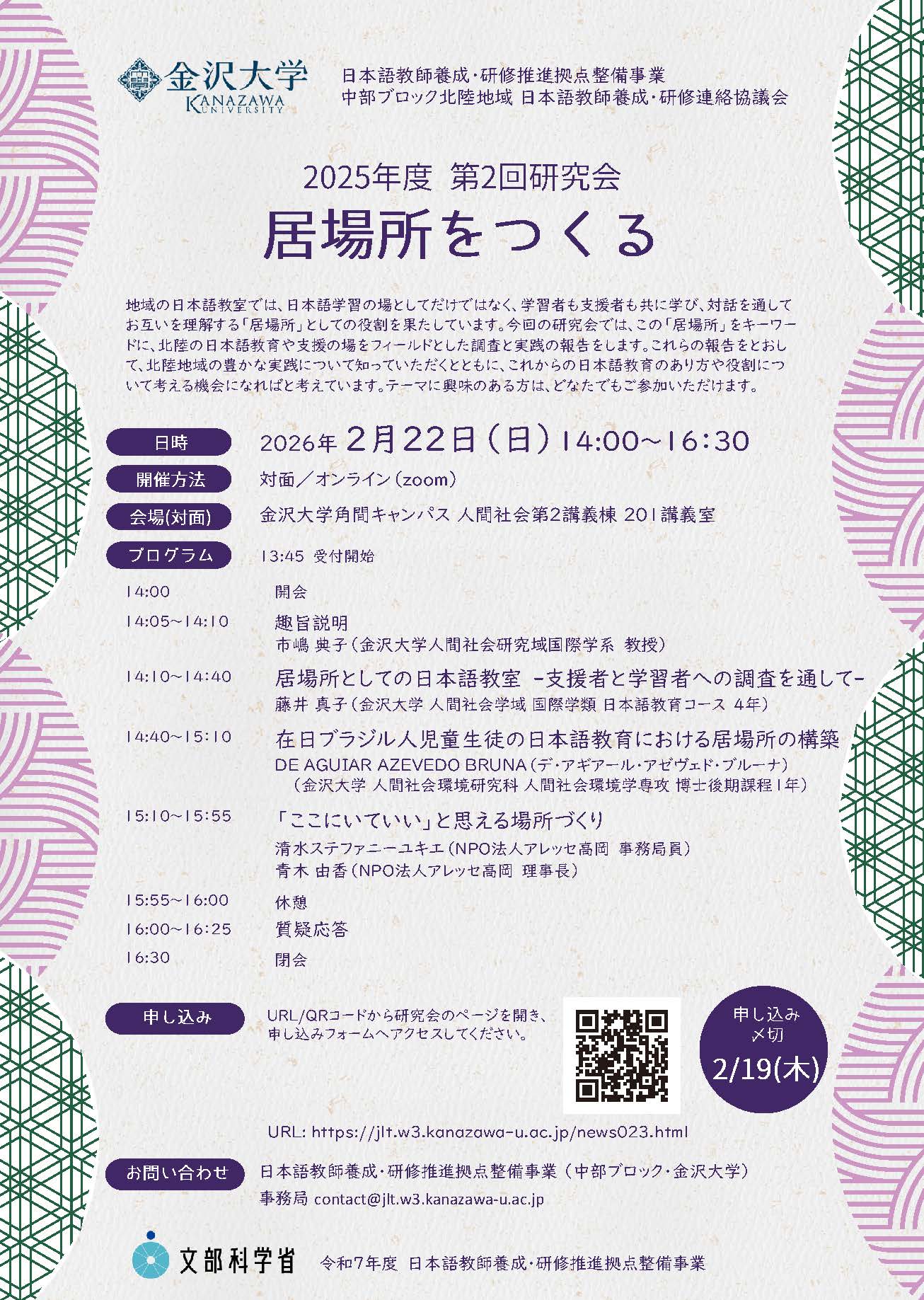その一環として,2025年度第2回研究会「居場所をつくる」を実施します。地域の日本語教室では,日本語学習の場としてだけではなく,学習者も支援者も共に学び,対話を通してお互いを理解する「居場所」としての役割を果たしています。今回の研究会では,この「居場所」をキーワードに,北陸の日本語教育や支援の場をフィールドとした調査と実践の報告をします。