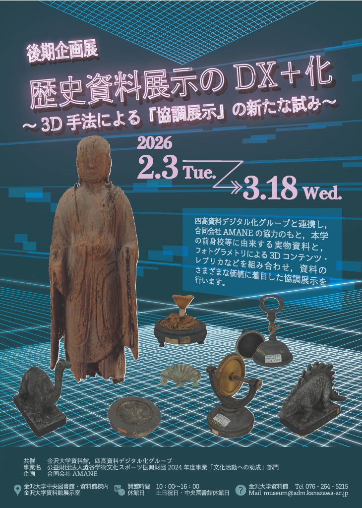 金沢大学資料館では,企画展「歴史資料展示のDX+化~3D手法による『協調展示』の新たな試み~」を開催しています。この展示は,当館と四高資料デジタル化グループ(研究代表:金沢大学学術メディア創成センター髙田良宏准教授,協力:合同会社AMANE)による共催展です。