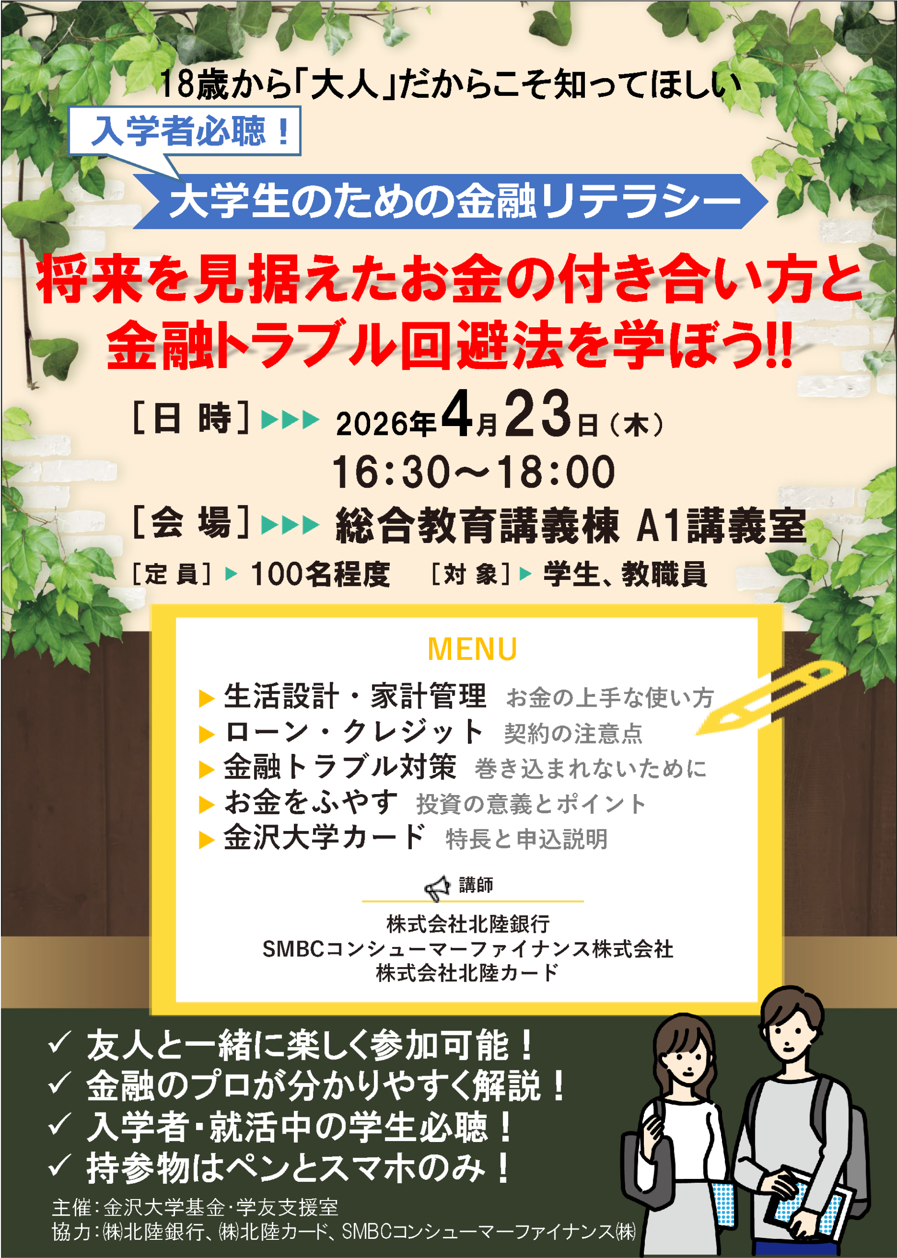 本セミナーでは,主に新大学1年生を対象とし,学生・教職員の皆さまに向けて,生活設計から金融トラブル対策,投資の考え方まで,今後の人生に役立つ金融リテラシーを金融のプロであるSMBCコンシューマーファイナンス,北陸銀行の講師の皆さんが易しく解説します。