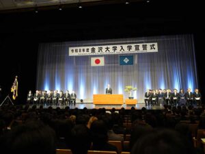 皆さんが入学した金沢大学は164年の歴史と伝統をもつ総合研究大学です。金沢大学は江戸時代の文久2年(1862年)、加賀藩彦三種痘所の設置を淵源とします。旧制第四高等学校等の前身校からの伝統を受け継ぎ、その伝統を守りながら、革新を積極的に織り込む気風があります。金沢大学では、令和4年5月に金沢大学未来ビジョン「志」を公表しました。オール金沢大学で「未来知」により社会に貢献するという「志」を明記しました。「未来知」とは、現在、ならびに未来の課題を探求し、克服するための知恵です。未来の新たな価値を創造することにつながります。皆さんのワクワクする知的好奇心を高めながら、自ら学び、自ら育むことができる環境も整っております。専門性を積み上げることはもとより、文理医の分野融合型のリベラルアーツ教育も強化しております。幅広い視野、高い視座、複眼的な視点を涵養することにつながります。さらに、金沢大学では大学院での深い学びの環境も充実させております。論語の一節に、「知之者不如好之者、好之者不如楽之者(これを知る者は、これを好む者に如かず。これを好む者は、これを楽しむ者に如かず)」とあります。ぜひ、充実したキャンパス生活を楽しみながら、大きく成長してください。