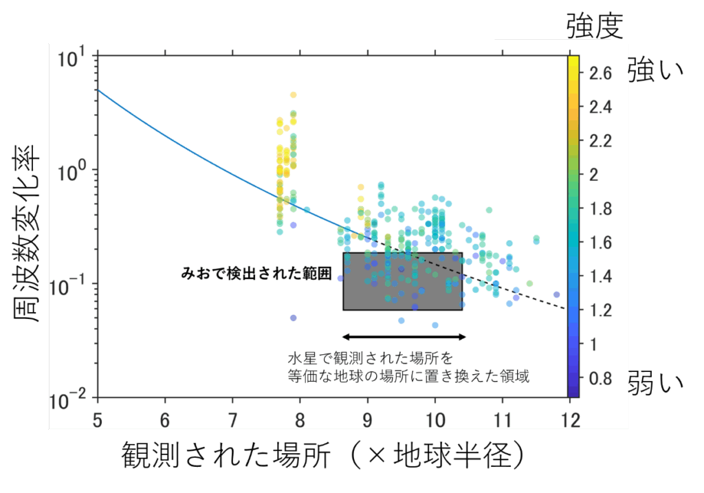 図 1:みお(灰色の長方形)と GEOTAIL(色付きの点)によるコーラス放射の周波数変化率の類似性