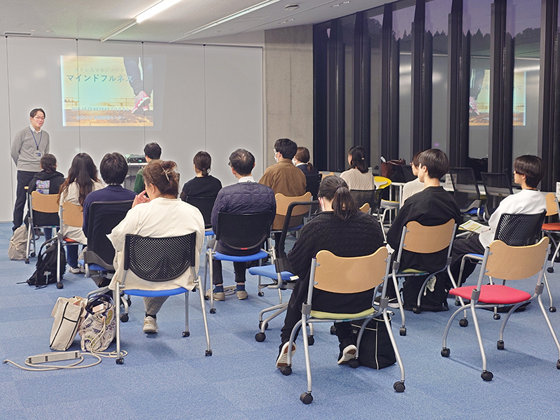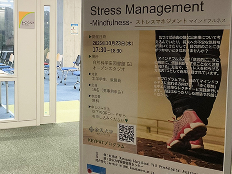 10月23日,こころのケアを目的とした支援チーム「KEYPAT」(※1)は,マインドフルネスのレクチャーと実践のプログラム「ストレスマネジメント マインドフルネス」を自然科学系図書館G1オープンスタジオで開催し,本学学生・教職員14名が参加しました。マインドフルネスは,過去の嫌な出来事について考え込んだり,将来への不安な気持ちが湧いたりして目の前のことに手がつかないときに,「意図的に,今この瞬間に,価値判断をすることなく注意を向ける」方法です。「歩く瞑想」を中心に,マインドフルネスの簡単なレクチャーと実践を行い,参加者同士,ストレス対処の方法や体験後の感想を話し合いました。