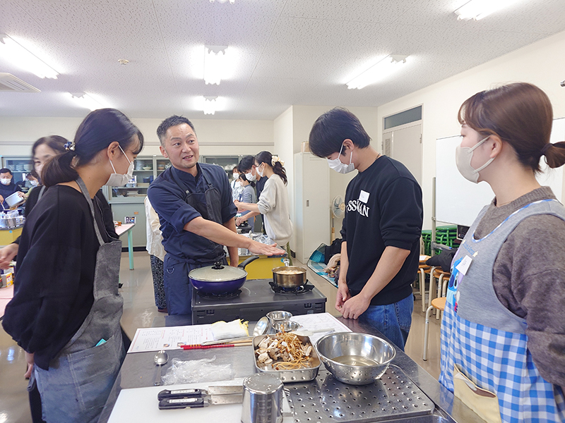 村上氏の指導を受けながら調理する学生ら -