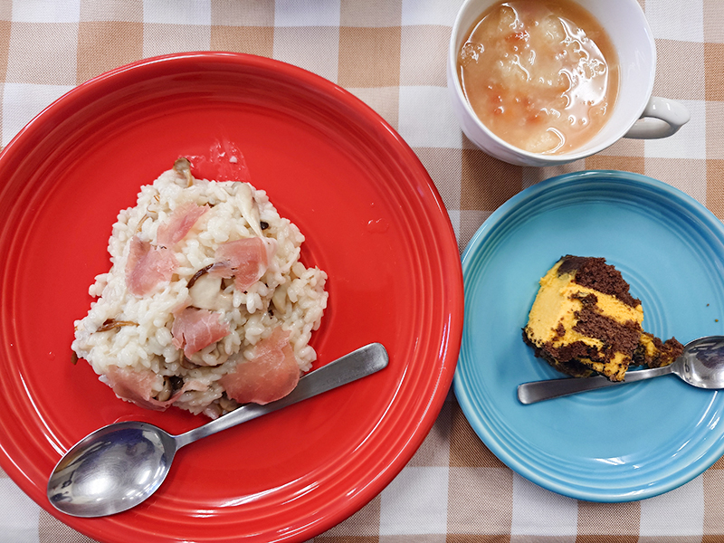 キノコと生ハムのリゾット・トマトとパンのスープ