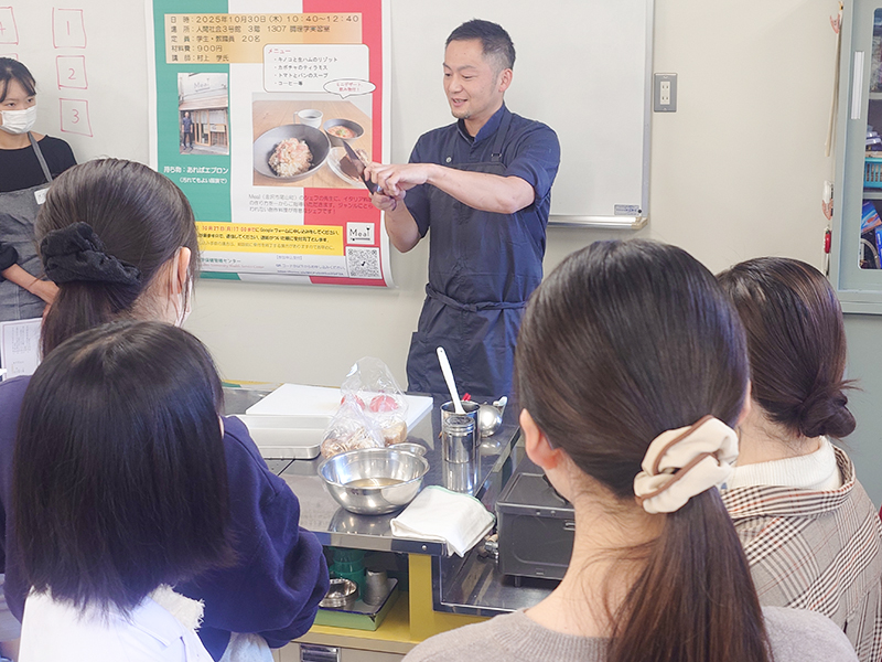 参加した学生らは,村上講師の指導の下,6つのグループに分かれ,「キノコと生ハムのリゾット」と「トマトとパンのスープ」を作りました。村上講師は,調理法のデモンストレーションをしながら,分かりやすく作り方を説明し,テーブルを回って直接指導しました。複数のキノコ(しめじ,椎茸,マッシュルーム,柿の木茸)を使用したリゾットとスープを,村上講師が調理したものと食べ比べながら,みんなでおいしく食べました。また,村上講師が調理したカボチャのティラミスも味わいました。質疑応答では,村上講師が特殊な食材ではなく,日常にある食材をどれだけおいしくしてお客様に提供できるかを大事にされているとの話が聞けました。
