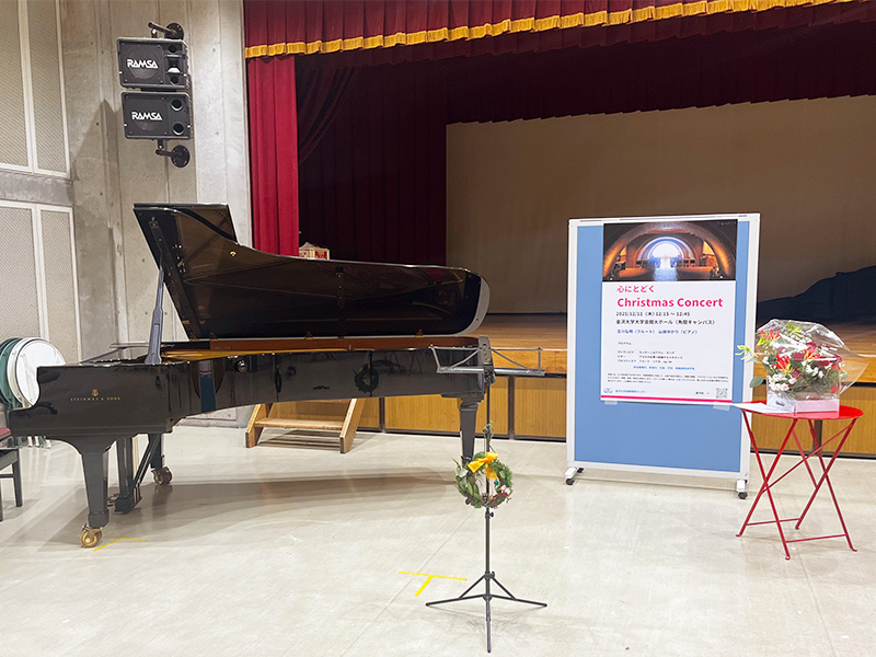 12月11日,保健管理センターは,「心にとどく クリスマスコンサート」を大学会館大ホールで開催し,学生・留学生,教職員約40名が参加しました。この演奏会は,昼休みに生演奏を聴きながら,心と体が癒やされる時間を過ごしてほしい,との思いで企画されたものです。