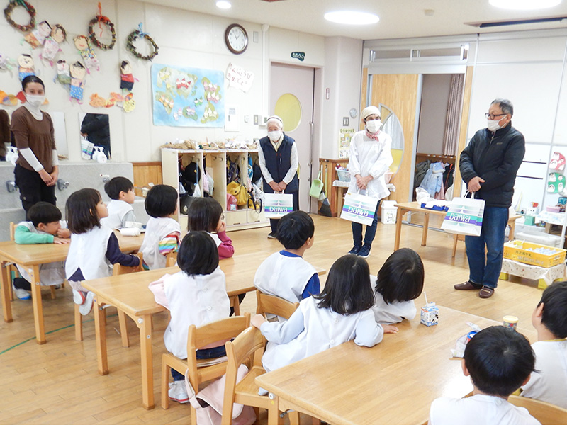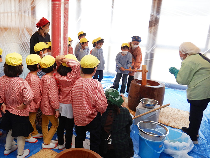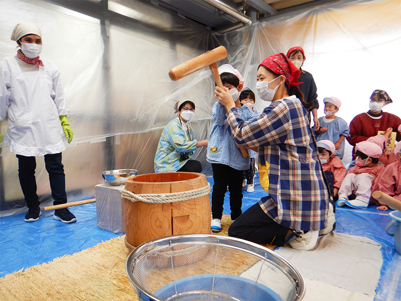 This annual mochitsuki event featured glutinous rice grown by the senior kindergarten class since spring in the satoyama area. The kindergarten invited members of Satoyama Mate—a local community group engaged in agriculture and satoyama conservation around Kakuma—to join the celebration. Together, they pounded rice cakes and enjoyed mochi with kinako (soybean flour) and sweet red bean paste.
