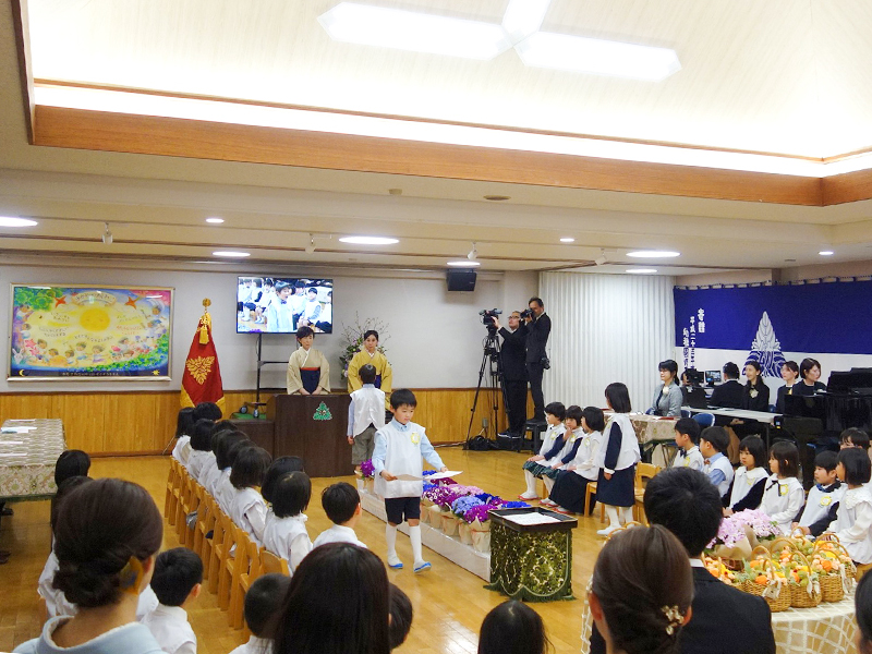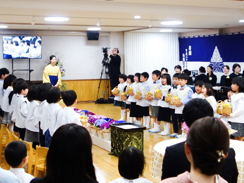 第77回附属幼稚園修了式を挙行 掲載日:2026-3-24 ニュース SDGs HOME chevron_right ニュース chevron_right 第77回附属幼稚園修了式を挙行 3月11日,附属幼稚園は第77回修了式を挙行しました。 修了生24名は,一人ずつ名前を呼ばれて元気に返事をし,西多由貴江園長から修了証書を受け取りました。修了生らはお別れの言葉を述べた後,「たいせつなたからもの」を合唱しました。 在園生は修了生に花かごを贈り,「空より高く」の歌で修了生らを送り出しました。 証書を受け取る修了生 花かごを手に