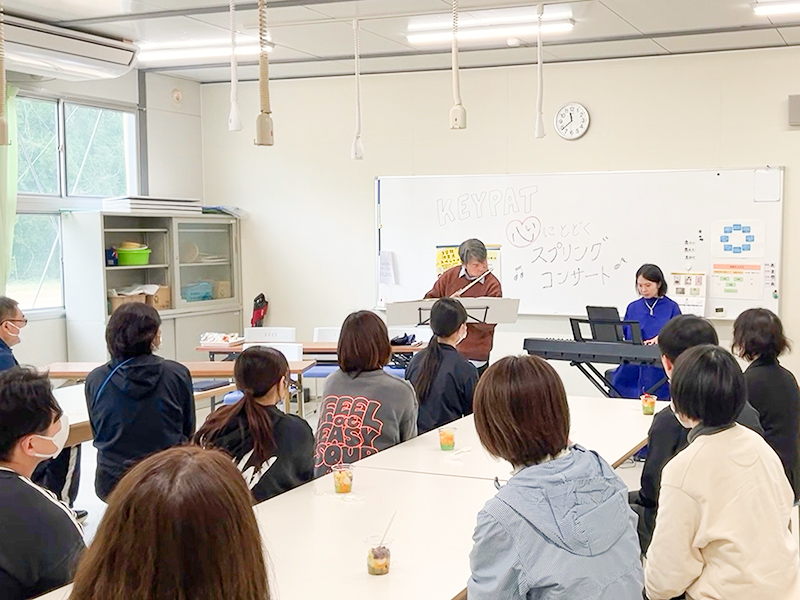 3日24日,本学のこころの支援チームKEYPAT(※)は,石川県立七尾特別支援学校輪島分校を訪問し,コンサートと食育プログラムを企画運営しました。KEYPATメンバーである吉川弘明名誉教授によるフルートと,プロのピアニストである山田ゆかり氏による「スプリング・コンサート」を実施した後,管理栄養士の指導のもと「豆腐入り白玉団子のフルーツあんみつ」作りを行い,小学部から高等部までの児童生徒と教諭ら約30名が参加しました。