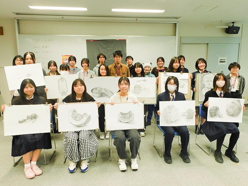 参加者からは「画塾で描く時とは違って周りに知らない人しかいなかったが,それが逆に新鮮で楽しかった。能登地域の方々と学年を超えて交流できたことも,とてもうれしかった。大学生の方々や先生方がみんな優しくて分かりやすかった」「デッサン初挑戦だったので緊張したけれど,大学生の方々が丁寧に教えてくださったので楽しくデッサンすることができました」といった感想が寄せられました。