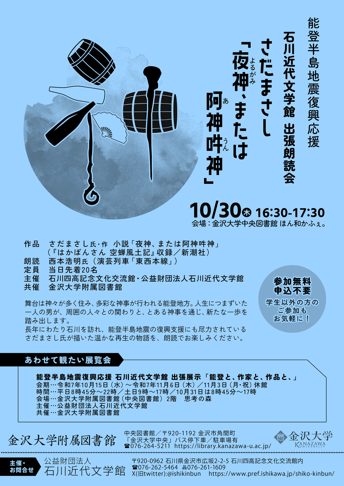 金沢大学附属図書館(中央図書館)において開催中の展示「能登と、作家と、作品と、」関連イベントとして,朗読会を実施します。