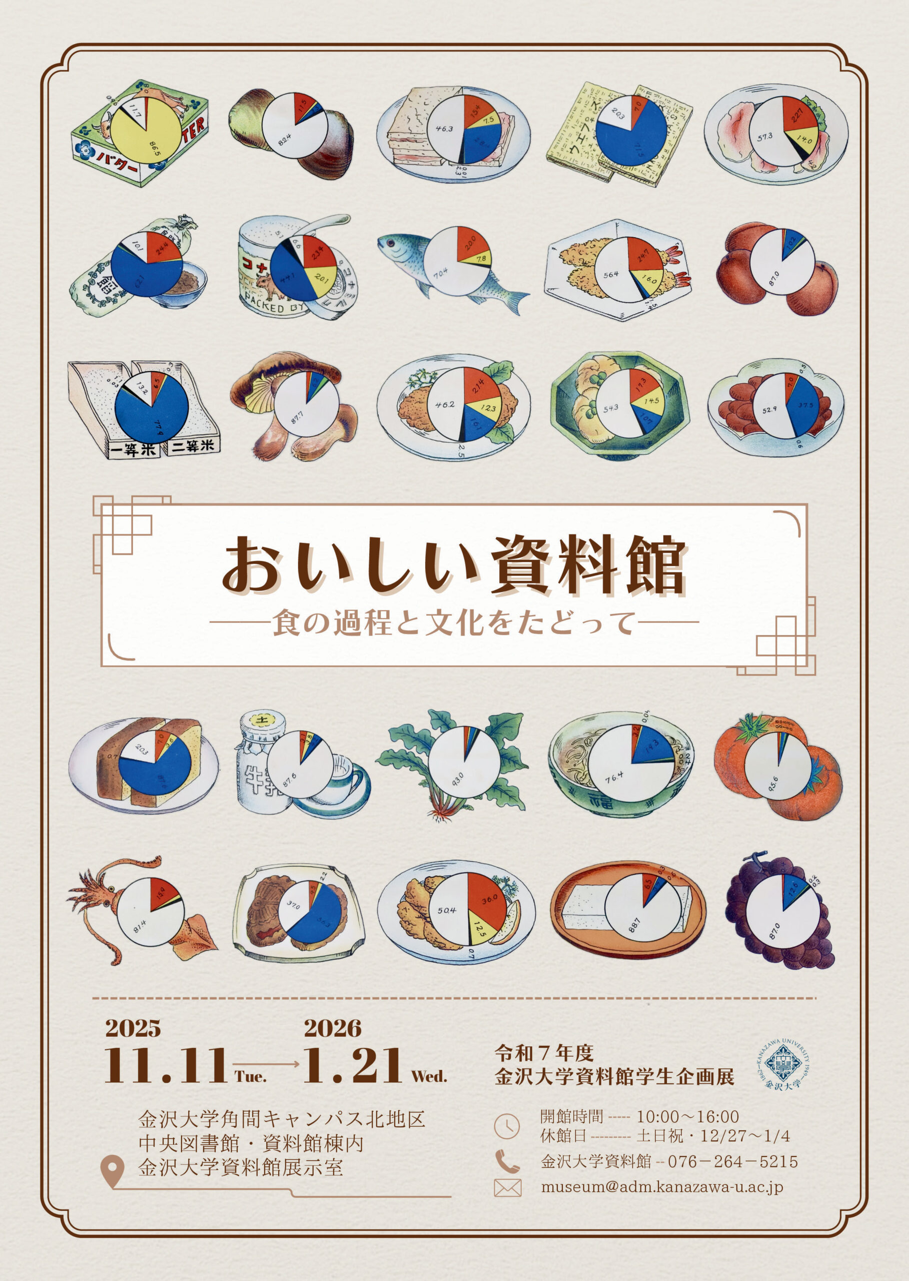 金沢大学資料館では,企画展「おいしい資料館―食の過程と文化をたどって―」を開催します。この展示は,本学で博物館実習を受講する学生による企画展です。テーマ設定から資料の調査,展示パネル・キャプションの作成,展示作業,ポスターやチラシの制作まで,ほぼ全ての学芸員業務を学生自ら行いました。