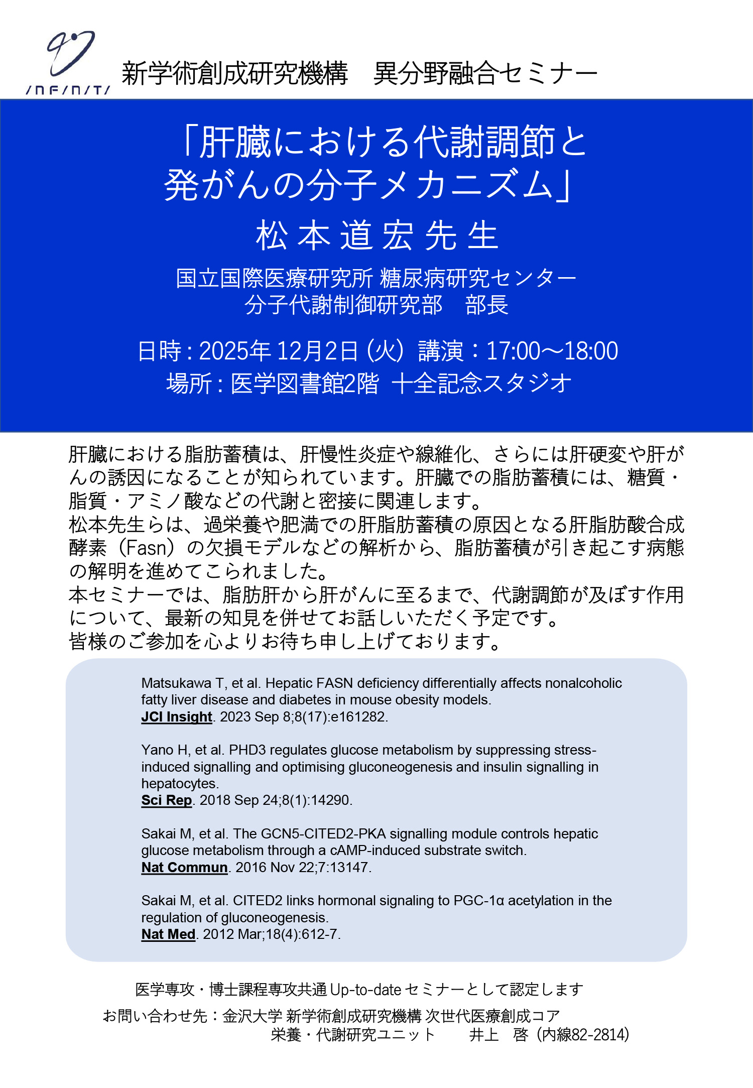 新学術創成研究機構 次世代医療創成コア 栄養・代謝研究ユニット 井上 啓 准教授 TEL:076-265-2814