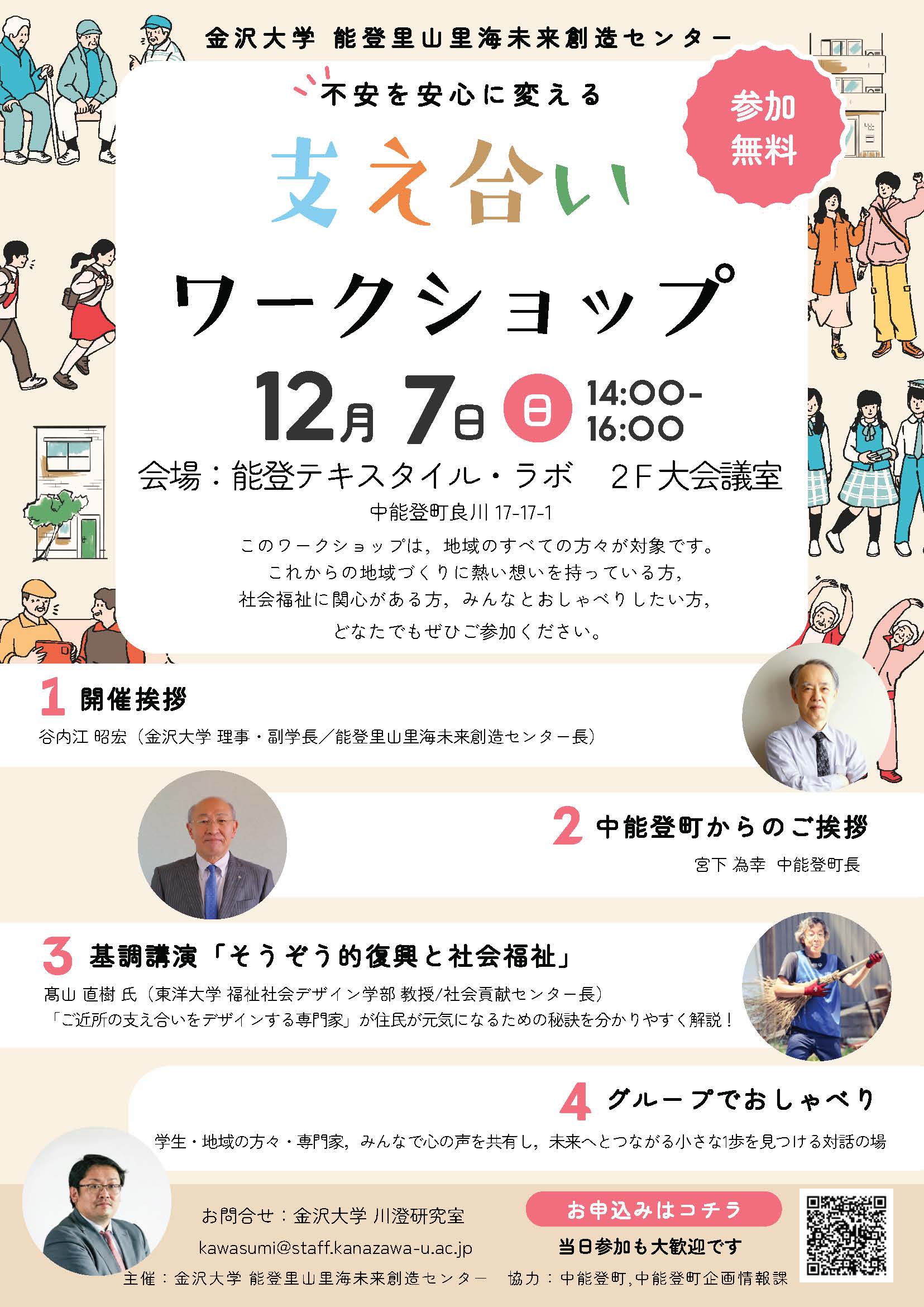 能登里山里海未来創造センターは,令和6年能登半島地震や奥能登豪雨で被災した地域の皆さまが自分たちの言葉で「支え合い」や「暮らしの再生」について語り合い,創造的復興に向けてこれからの地域づくりを一緒に考えることを目的とした「第1回 不安を安心に変える 支え合いワークショップ」を開催します。