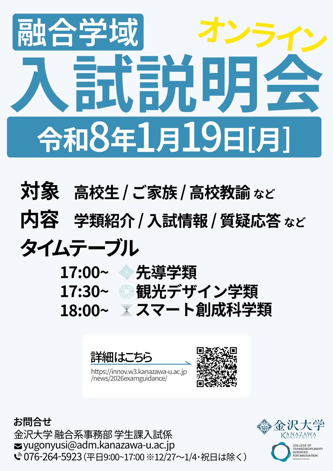 金沢大学 融合系事務部 学生課入試係 【E-mail】yugonyusi(a)adm.kanazawa-u.ac.jp ※(a)は@に置き換えてください