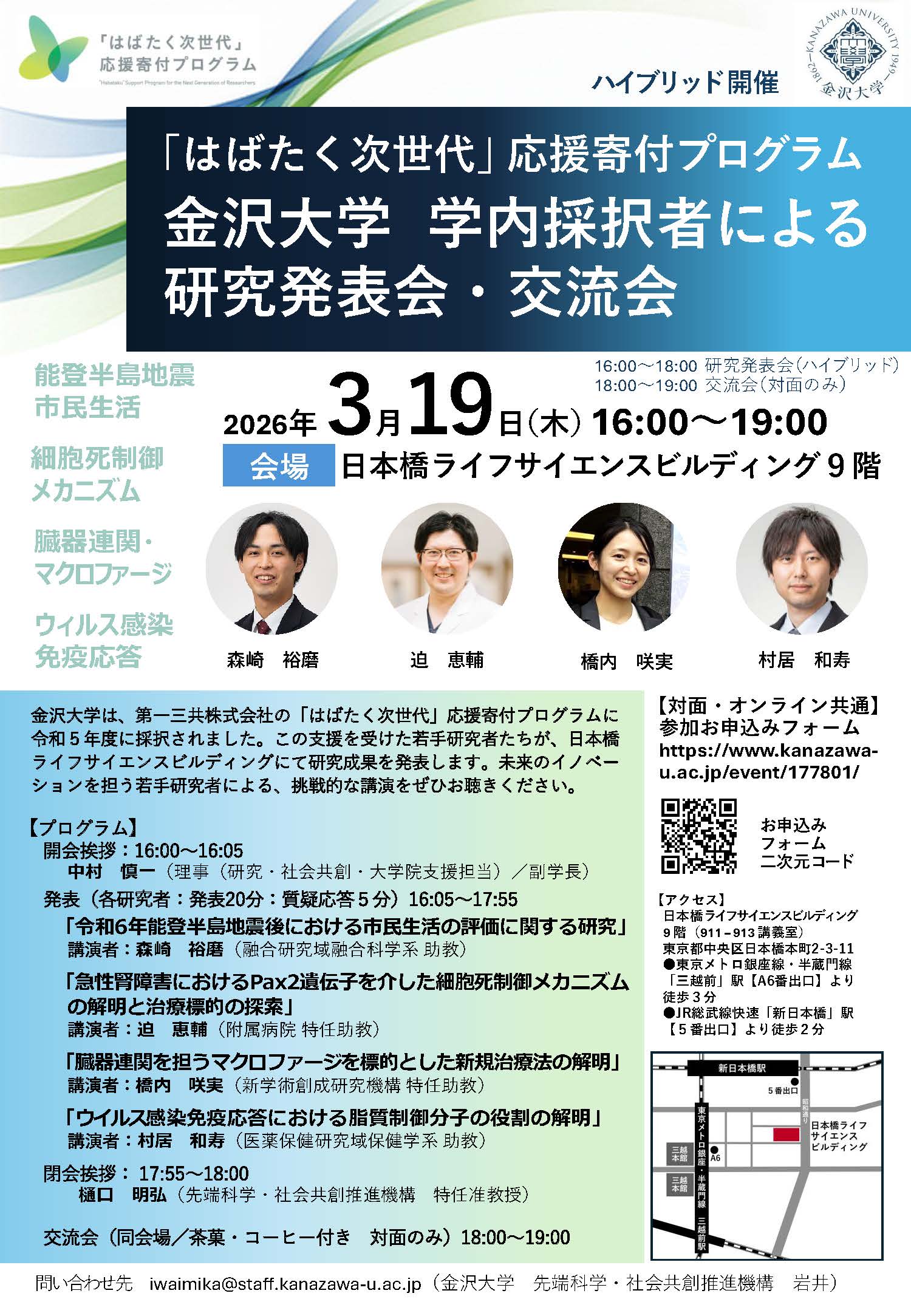 本学は,第一三共株式会社の「はばたく次世代」応援寄付プログラムに令和5年度に採択されました。この支援を受けた若手研究者たちが,日本橋ライフサイエンスビルディングにて研究成果を発表します。未来のイノベーションを担う若手研究者による,挑戦的な講演をぜひお聴きください。