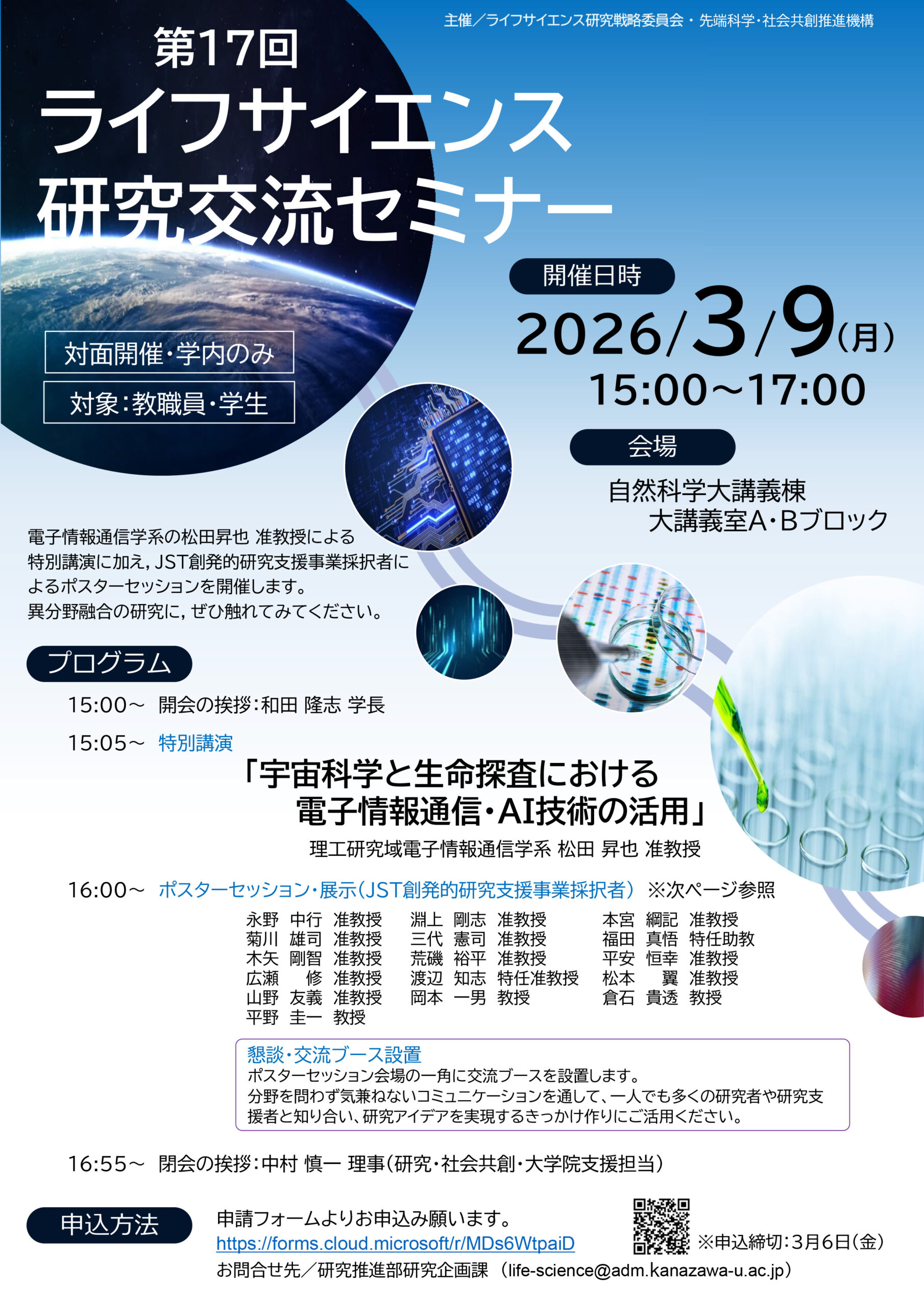 第17回となる今回は,理工研究域電子情報通信学系の松田昇也准教授が,「宇宙科学と生命探査における電子情報通信・AI技術の活用」と題して講演を行います。また,JST創発的研究支援事業採択者によるポスターセッションを併せて開催します。