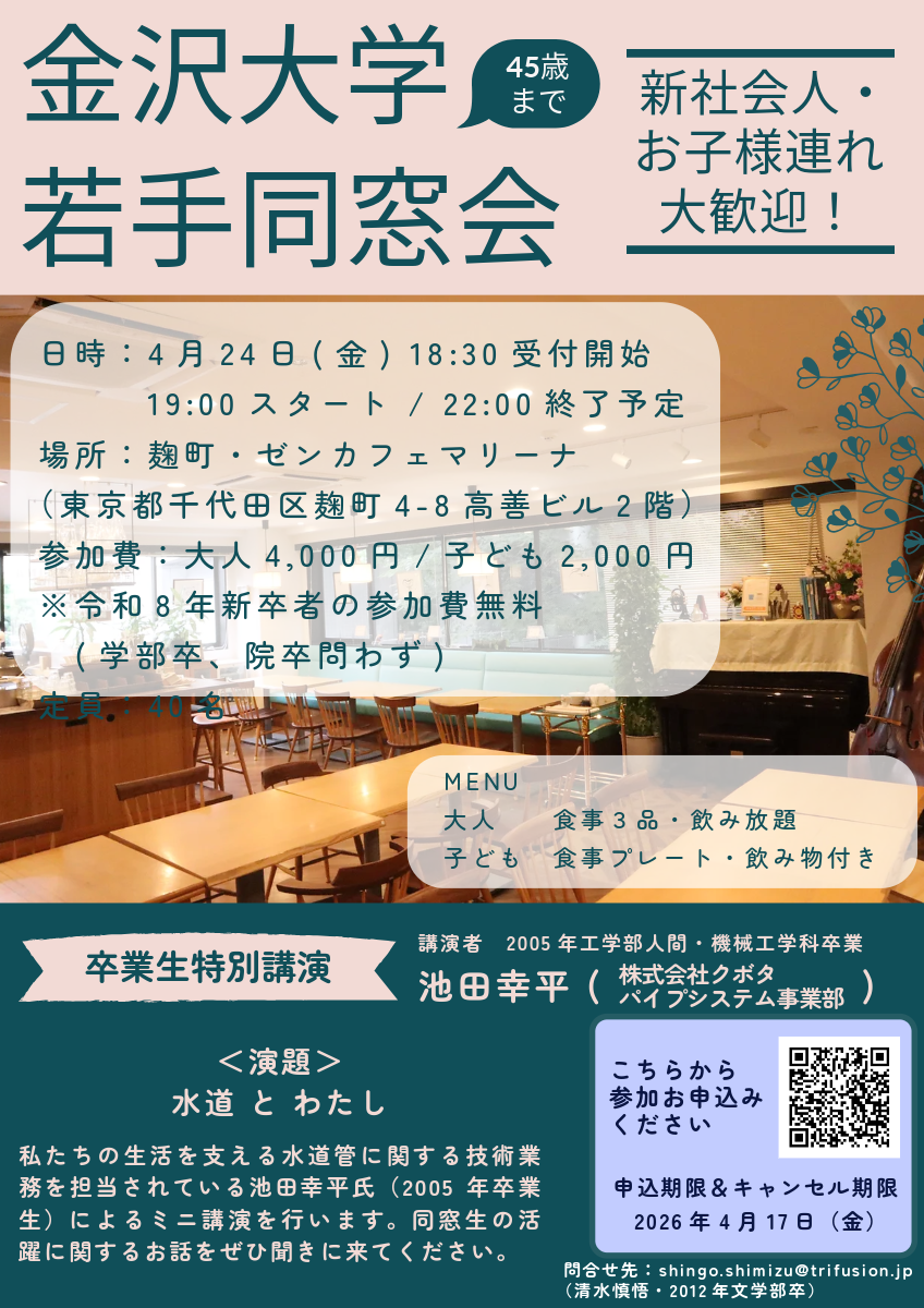 このたび,関東で活躍する若手・中堅世代を中心に,「金沢大学若手同窓会 in 東京 2026」 を実施します。今回は,これから新たな一歩を踏み出す令和8年度新卒者(学部卒・院卒問わず)は無料で参加できます。