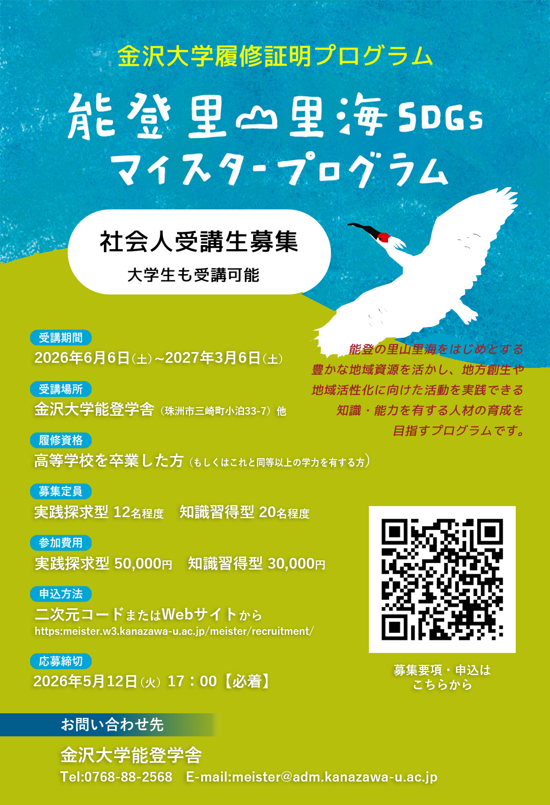 金沢大学能登学舎 TEL:0768-88-2568 E-mail: meister(a)adm.kanazawa-u.ac.jp ※(a)は@に置き換えてください。