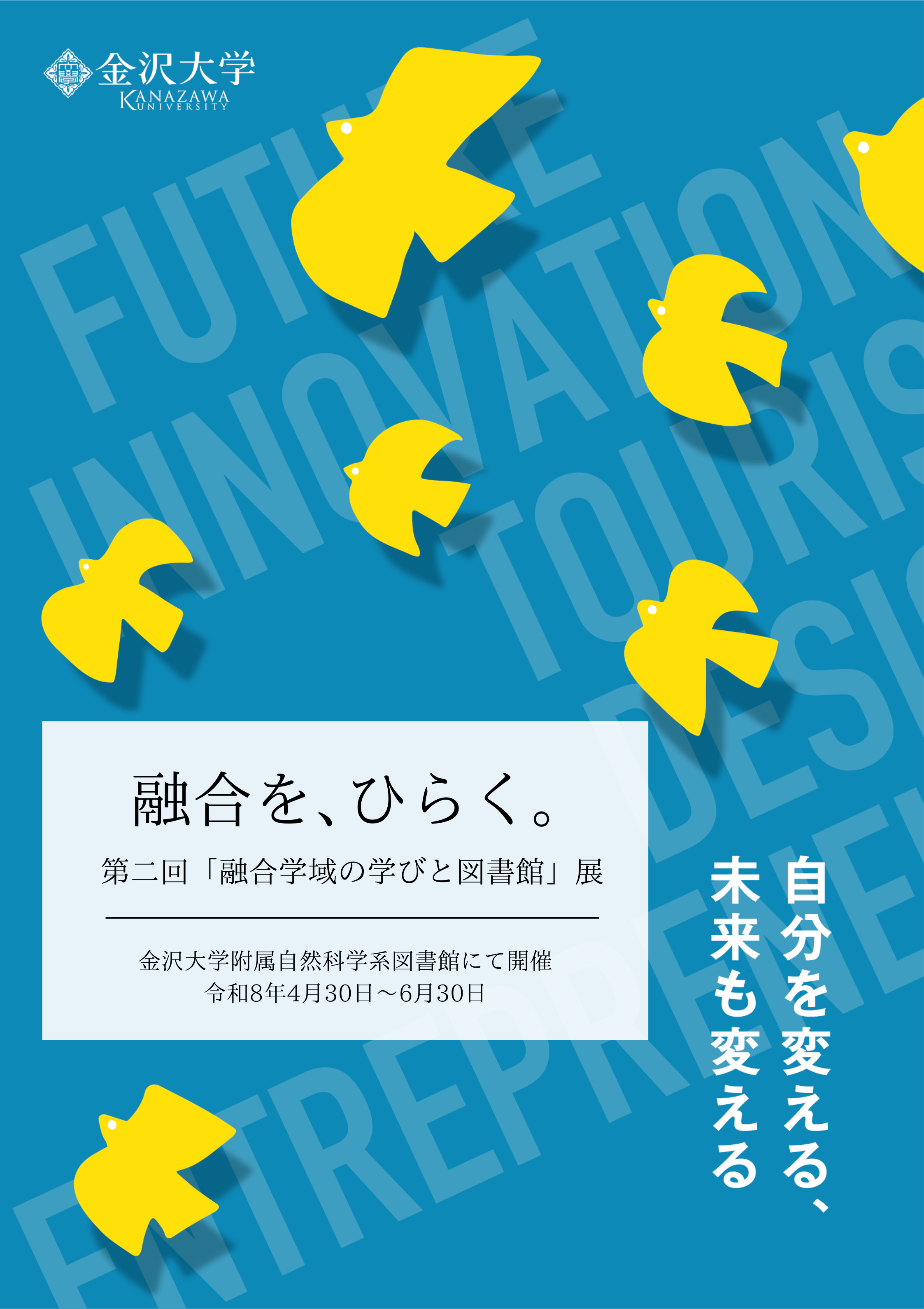 4月30日から6月30日の期間,金沢大学自然科学系図書館のエントランスで「融合を、ひらく。第二回『融合学域の学びと図書館』展」を開催します。