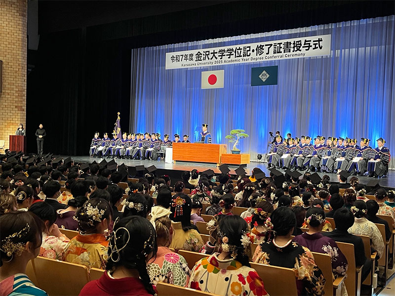改めまして、皆さんには生涯にわたり実りある幸せな人生を過ごしてほしいと思います。皆さんが「金沢大学ブランド人材」として、国内外の舞台で活躍し、社会に貢献されることを強く祈念し、告辞とします。