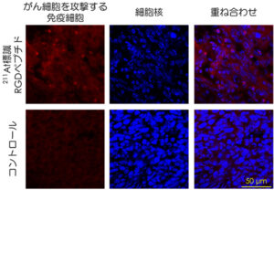 本研究では、211At 標識 RGD ペプチド(※3)による治療で、がん免疫が誘導されることを確認しました。さらに、211At標識RGDペプチドと免疫チェックポイント阻害薬(※4)を併用することで、がん免疫の誘導が強化され、相乗的に治療効果が増強されることが明らかになりました。本成果は、標的 α 線治療と免疫療法を組み合わせた、次世代のがん治療法の実現に向けた大きな一歩になると期待されます。