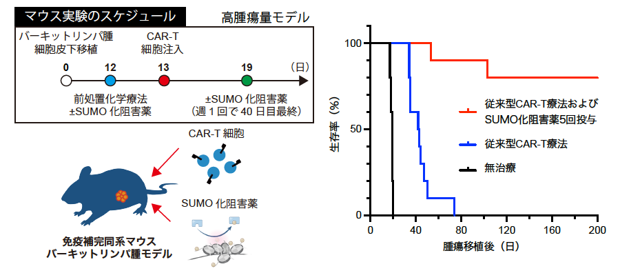 本研究では、小谷助教らが最近発見した、SUMO 化(※3)経路を阻害するエピゲノム治療薬(※4)が MYC を阻害する作用(参考文献 1)および免疫反応を活性化する作用(参考文献 2)に着目し、これらをバーキットリンパ腫に応用しました。さらに、CAR-T細胞療法と組み合わせることで、治癒率が飛躍的に向上することを示しました。