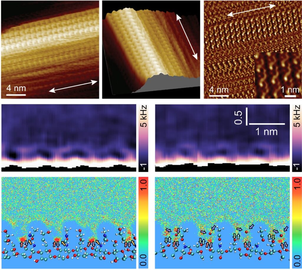 図1. (上段)βキチン結晶表面のAFM像。分子レベルで緻密に並んだ構造が描写されている。(中段)キチン結晶表面上で得られた3D-AFM像。結晶表面の分子レベル構造に応じてアーチ状の水和構造が形成されている様子が可視化されている。(下段)水和構造のMDシミュレーションの結果。
