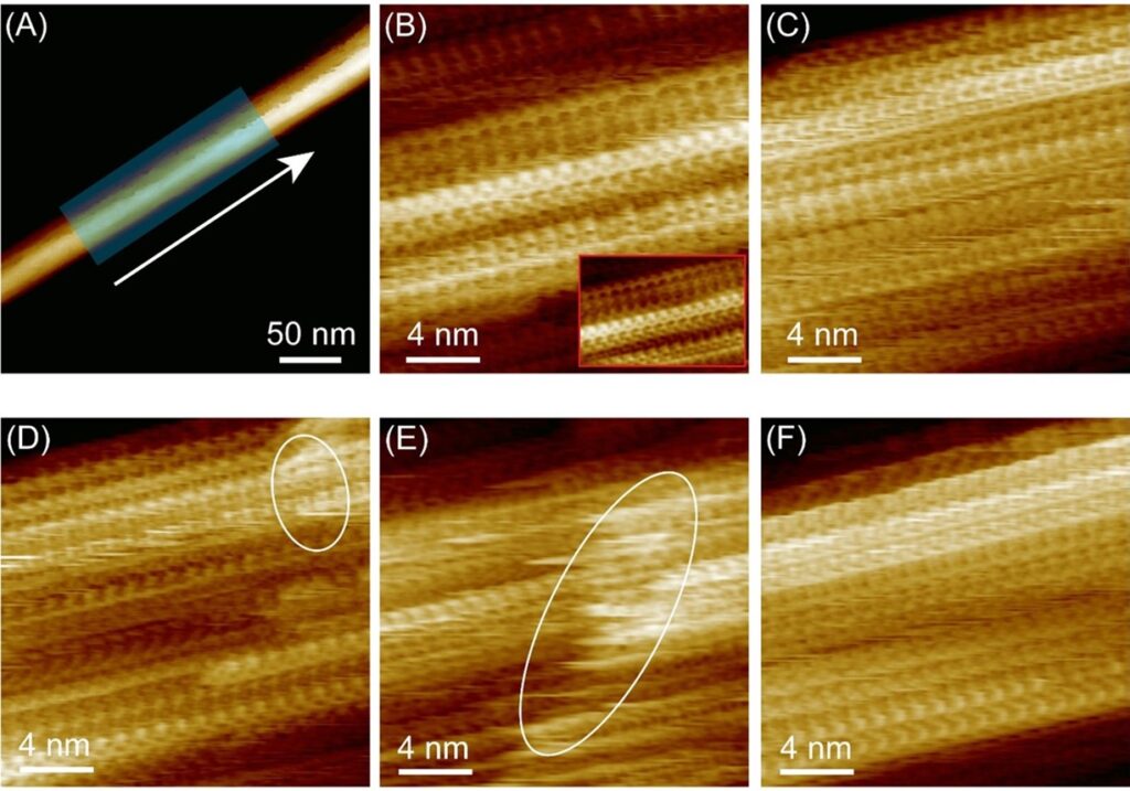 図 2. βキチン結晶表面における構造の不均一性。(A)雲母基板上に固定化されたβキチン結晶の液中 AFM 像。(B–F)結晶の繊維軸方向に沿って取得された高分解能 AFM 像(各像に示された楕円:部分的に乱れた領域)。