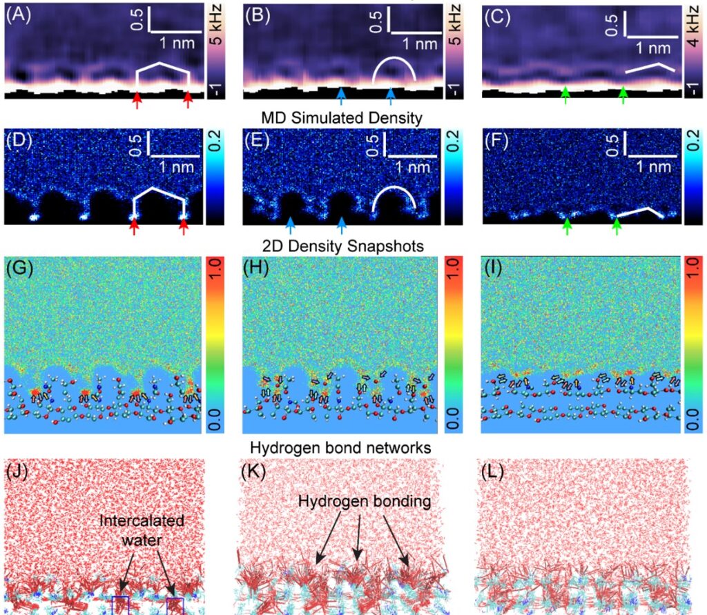 図 3. 実験データと MD シミュレーションの比較。(A–C)実験的に観察されたβキチン結晶表面の分子鎖方向に沿った垂直断面の周波数シフト分布像(2D-xz)。(D–F)MD シミュレーションした垂直断面における水分子の密度分布像(赤・青・緑の矢印:実験像とシミュレーション像で類似した水和構造のパターン)。(G–I)キチン分子鎖の近傍に存在する水分子の密度分布のスナップショット。(J–L)MD シミュレーションしたβキチン結晶表面と水分子との間に形成された水素結合ネットワーク。