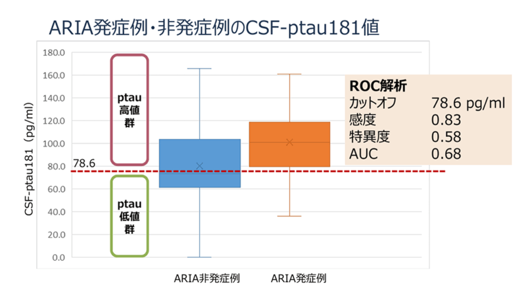 ARIA 発現群では非発現群に比べて有意に CSF-ptau181 濃度が高値でした。ROC 解析では、カットオフを 78.6 pg/ml としたとき感度 83%、特異度 58%、AUC 0.68 でした。