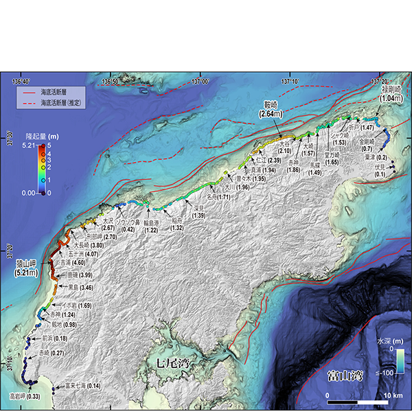 一方、海底地形データや地層探査データの解析から、隆起をもたらした活断層が海岸線にほぼ平行して連続的に延びていることが明らかとなりました。隆起量が特に大きかった場所は断層線に近接する陸域に集中しており、南に傾斜した逆断層の活動によって隆起量分布が説明できることが確認されました。