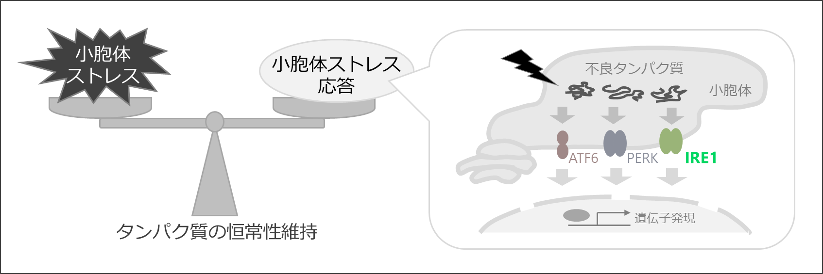 タンパク質を折りたたむ小胞体が過負荷に陥ると「小胞体ストレス」が生じ、細胞はそれに対処するために「小胞体ストレス応答」を誘導する。IRE1 は小胞体ストレス応答の主要な経路の一つ。