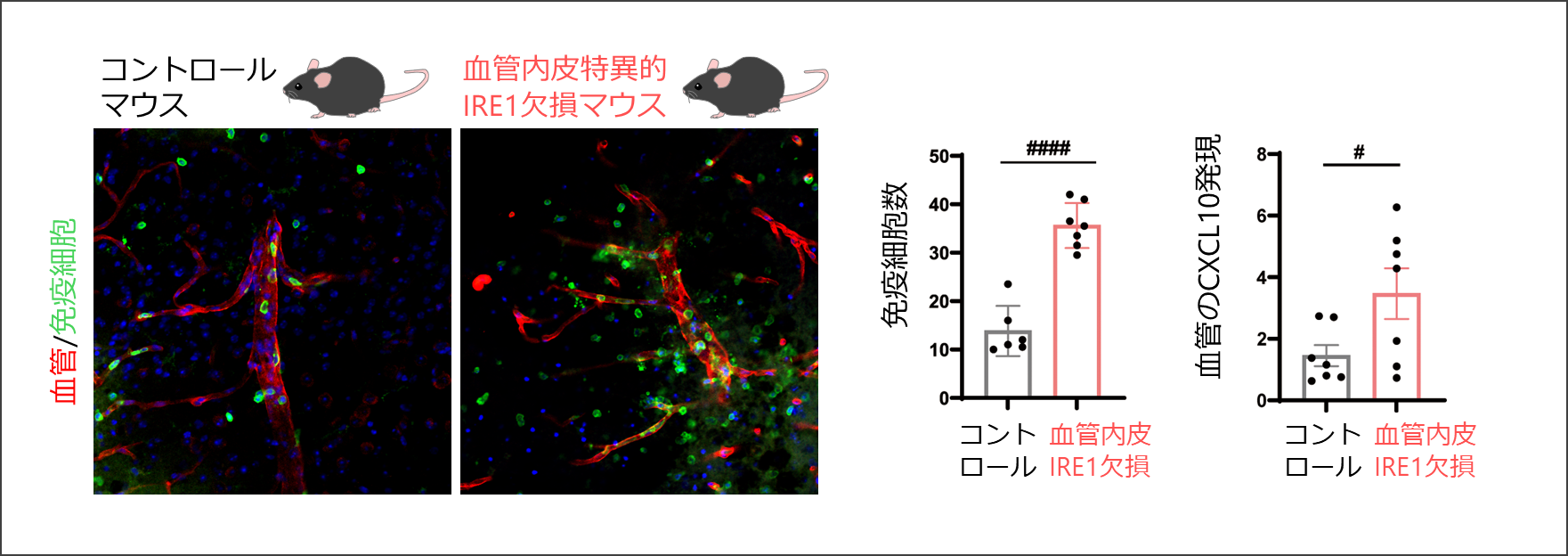血管内皮特異的IRE1欠損マウスでは、脳外傷後に脳内に浸潤したCD45陽性免疫細胞数や、免疫細胞を遊走させるケモカインCXCL10の血管内皮における発現が増加した。