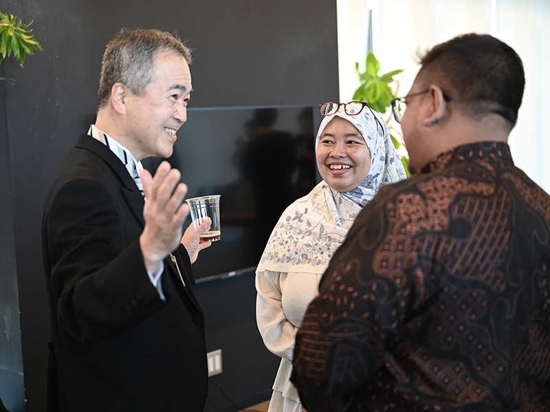 和田隆志学長による英語での挨拶後,今年度入学者が学長や森本章治教育担当理事,各研究科長と自由に歓談する時間が設けられました。和田学長も各グループを回り入学者と歓談し,懇親会は和やかな雰囲気の中で執り行われました。