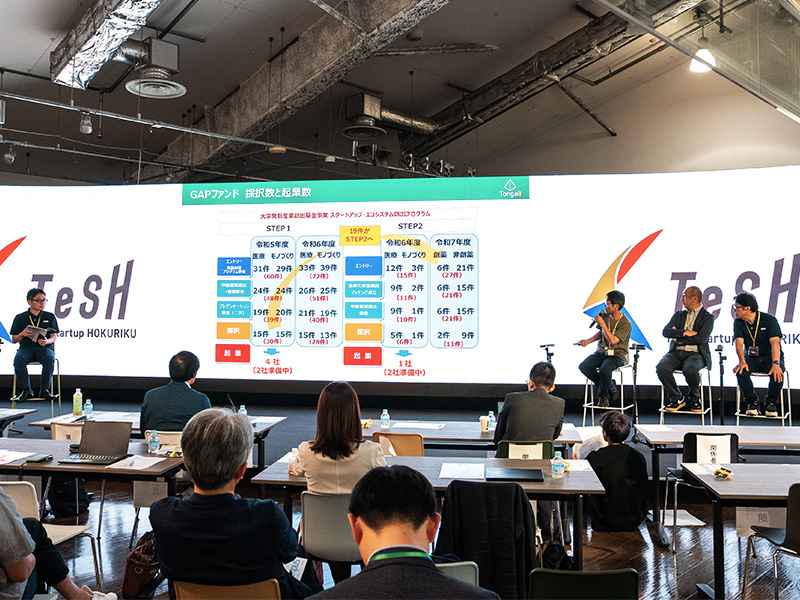 後半は,TeSH GAPファンド採択研究者によるプレゼンテーションに続き,「グローバル市場に挑むための戦略と支援体制」および「北陸発テックイノベーションの可能性」をテーマに,研究者が事業化の過程で直面する課題に焦点を当てたパネルディスカッションを展開しました。