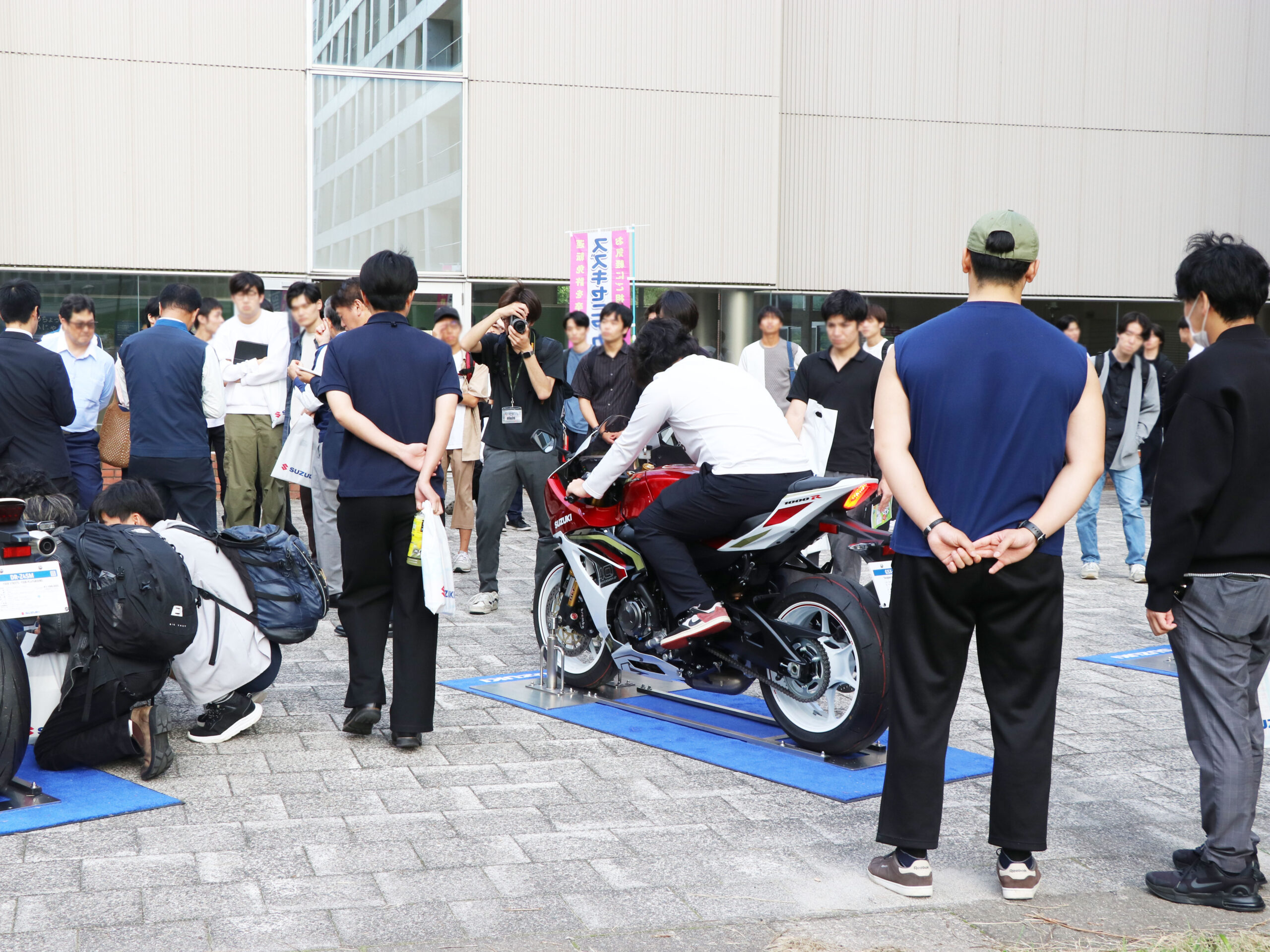 角間キャンパス南地区の屋内や中庭には,鈴鹿8時間耐久ロードレースに参戦した同社のバイクや,電動モビリティなどの最新技術が展示され,学生は技術者などとの交流や体験を通じて,モビリティ業界が取り組む未来課題の挑戦について理解を深めました。