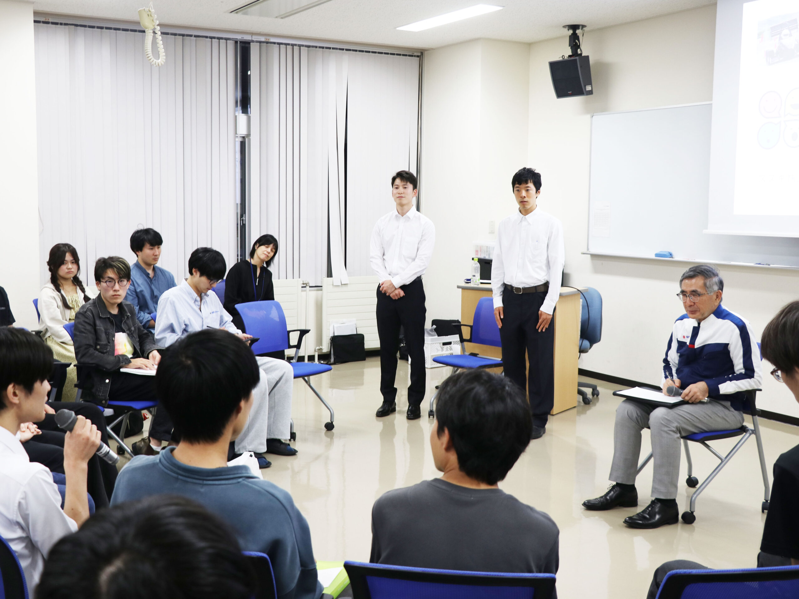 講演の後には,鈴木社長と交流事業「雑談のチカラ」を実施し,鈴木社長からの「お客様目線で何をしたらよいのかを常に考え,全体最適となる技術者の視点を持つこと。重要なのは信念です」というアドバイスに,学生たちが熱心に聞き入っていました。