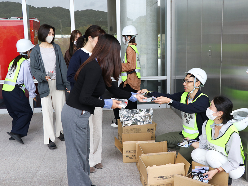さらに,今年度から新たな取り組みとして,防災備蓄品の配布訓練を実施しました。避難訓練の参加者へ実際に備蓄品の配布を行いながら,災害時の物資提供の流れを確認することで,日頃からの備えの重要性について理解を深めました。