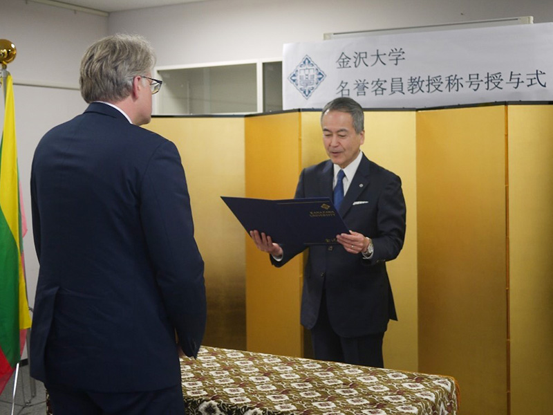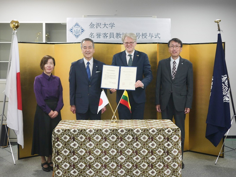 授与式では,和田隆志学長から称号記が授与されました。その後の懇談では,大使が金沢で学ぶことになったきっかけや留学中の思い出が語られ,本学との強い繋がりを再確認されました。今回の称号授与が,本学とリトアニアとのさらなる交流を促進することが期待されます。