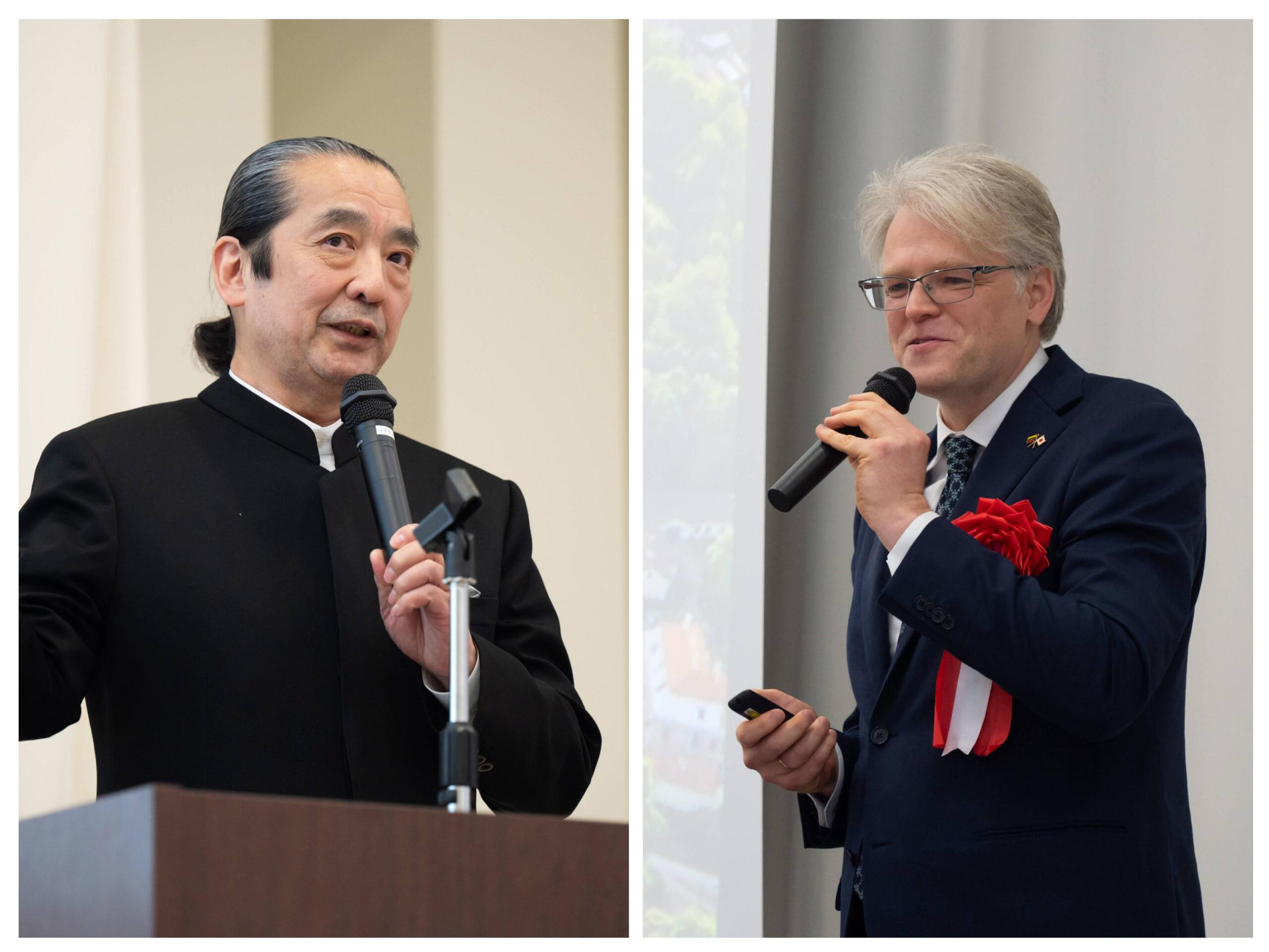 特別講演では,日本政府の国費留学生(日研生)として本学日本語・日本文化学プログラムを修了されたオーレリウス・ジーカス駐日リトアニア特命全権大使,そして本学大学院理学研究科生物学専攻を修了された現代美術家の中村元風氏が講師として登壇しました。両氏はそれぞれの専門分野での経験や本学での学びが現在の活動にどう生きているかを熱く語り,参加者は深い感銘を受けていました。講演後の対談では,異なる分野の二人が意見を交わし,会場は大きな共感と拍手に包まれました。