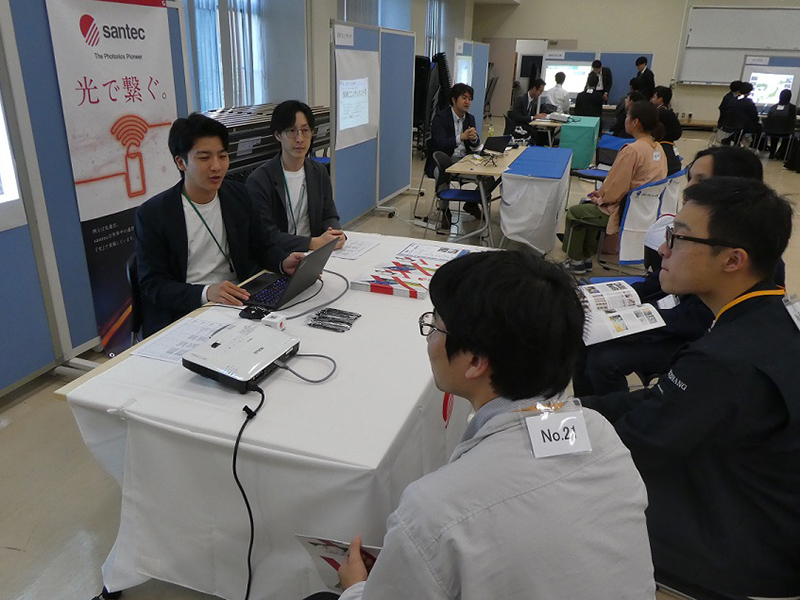 当日は,博士課程・博士後期課程の在学生や博士課程・博士後期課程進学が決定している修士課程・博士前期課程学生ら約50名が参加しました。企業側からは,株式会社サイバーエージェント,santec Holdings株式会社,JFEテクノリサーチ株式会社,澁谷工業株式会社,信越化学工業株式会社,株式会社ダイセル,タワーパートナーズセミコンダクター株式会社,津田駒工業株式会社,株式会社とめ研究所,株式会社日本入試センター,ヌヴォトンテクノロジージャパン株式会社,マルホ株式会社,国立研究開発法人産業技術総合研究所,計13社の研究・開発職や人事担当の方が参加しました。