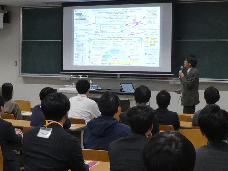 オープニングセミナーでは,本学の森本章治理事から参加企業および学生へのあいさつがあり,本交流会の趣旨や意義,また,本学が今年度採択された文部科学省「未来を先導する世界トップレベル大学院教育拠点創出事業」における大学院教育の高度化と博士人材のキャリア構築を統合的に推進,多様なロールモデルの提示,キャリアパスの拡充などの取り組みについて説明がありました。