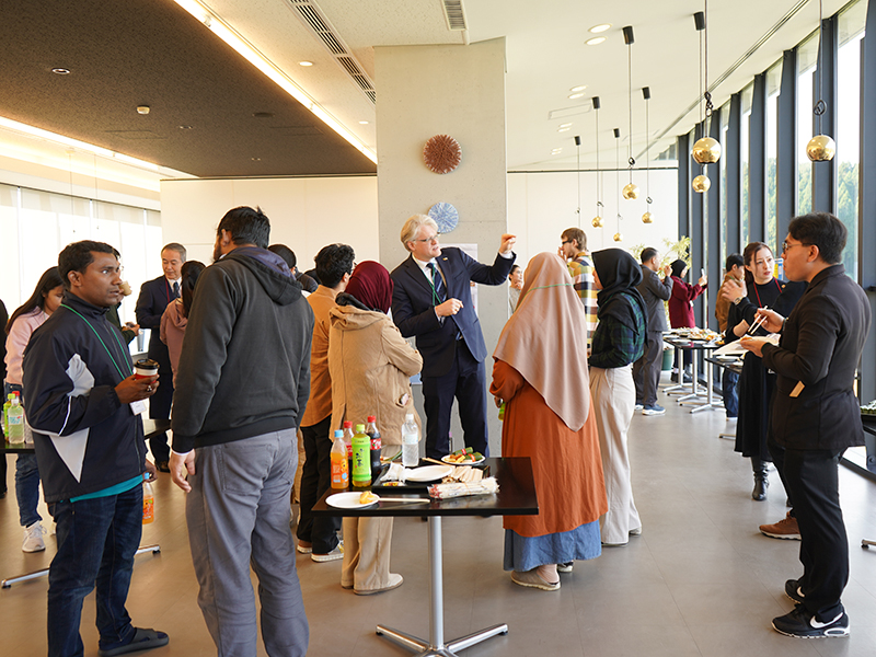 続くランチ交流会では,留学生同窓生4名による自己紹介を交えながら,終始和やかな雰囲気の中で交流を深めました。海外同窓会会長らから寄せられたビデオメッセージも上映され,同窓生と在学生が笑顔で語らいながら親交を深める様子が見られました。本学との絆を改めて実感し,学生として,卒業生としての誇りを胸に刻む,心温まるひとときとなりました。