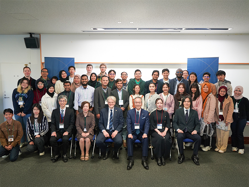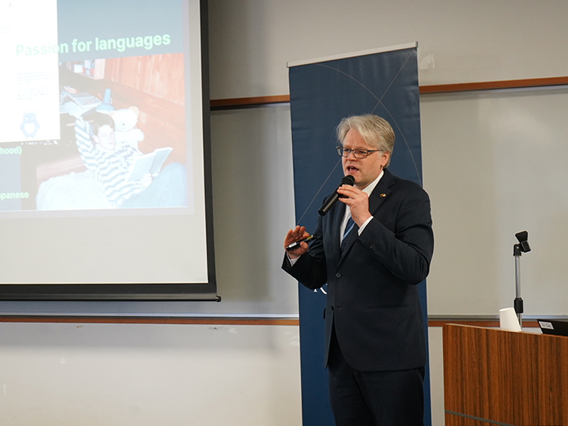 和田隆志学長のあいさつから開会し,特別講演には,前日の金沢大学ホームカミングデイに引き続き,オーレリウス・ジーカス駐日リトアニア共和国特命全権大使が登壇しました。1998年から1年間,日本政府の国費留学生(日研生)として本学で学ばれたジーカス大使は,国際情勢の揺らぎの中で過ごした思春期のエピソードや,本学での学びとその後のキャリアについて語り,「目の前のことを一生懸命挑戦してきたことで現在の自分がある」というメッセージを伝えました。講演後には,留学生同窓生や在学生から活発な質問が寄せられました。