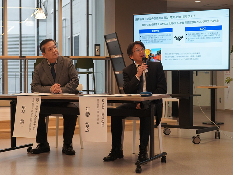 協定締結式には,KDDI 株式会社経営戦略本部の江幡智広副本部長と本学先端科学・社会共創推進機構長の中村慎一理事が出席しました。