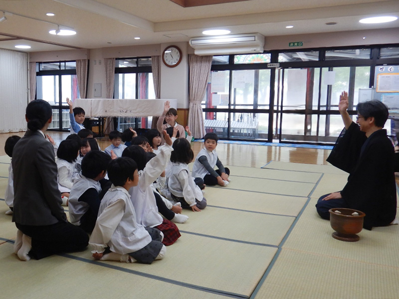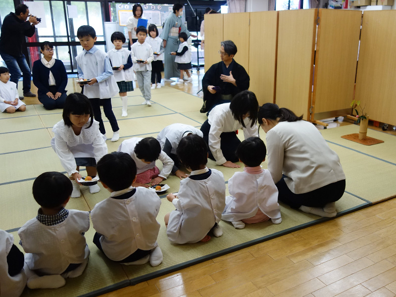 今年も裏千家今日庵業躰の奈良宗久氏にお点前を披露していただき,年長児が運んだ上生菓子と抹茶をみんなで味わいながら,茶道で大切な感謝の心を学びました。また,年長児も抹茶を点て,日本の伝統文化に触れるいい機会となりました。