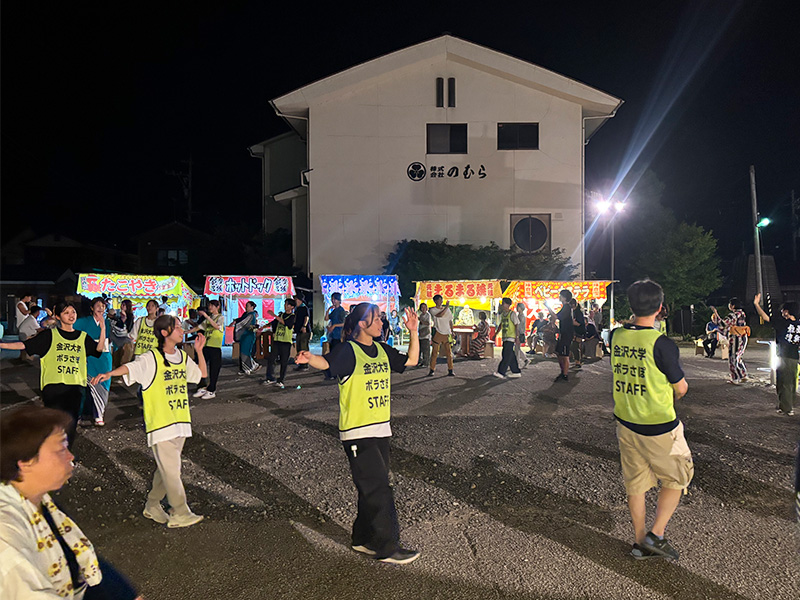 8月14日,17日, ボラさぽの学生と原田講師は,輪島市重蔵神社にて,物資の貯蔵庫として使用されていたテントの解体や,輪島市における伝統行事の一つである三夜踊りへの参加と同行事の設営補助などを行いました。また,8月23日には, 輪島市重蔵神社が主催する輪島市最大級のキリコ祭りの一つである重蔵神社大祭に運営補助やみこし担ぎの担い手として参加し,地元の方々や早稲田大学, 東洋大学, 明治学院大学, 北陸先端科学技術大学院大学の学生および教職員らと共に地域を盛り上げました。8月24日には,輪島市住吉神社が主催する大宮祭に参加し,みこしやキリコの担ぎ手として地元の方々と交流を深めました。